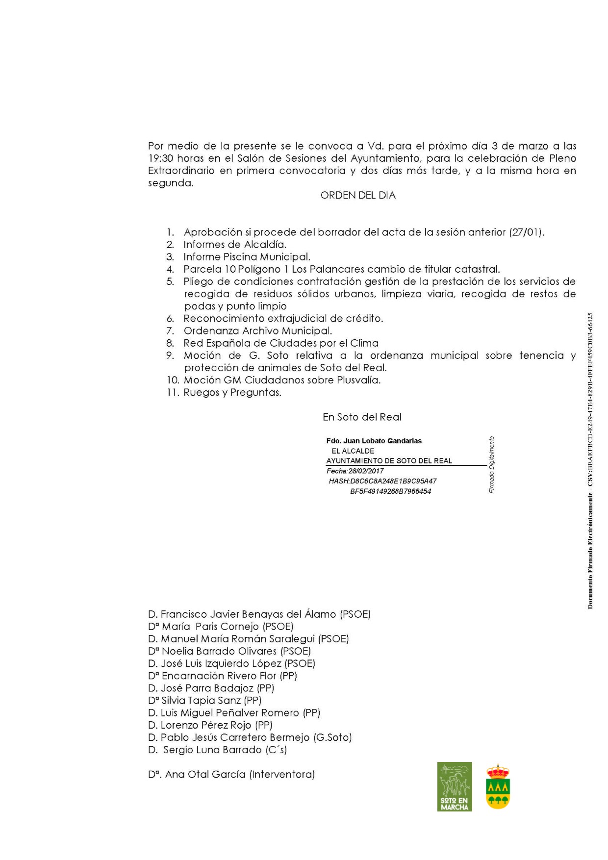 • Convocatoria Pleno Extraordinario 3 de marzo a las 19:30h.