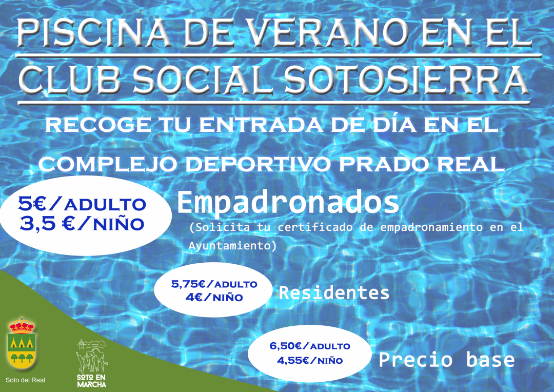 El Ayuntamiento de Soto del Real ha firmado un acuerdo con el Club Social SotoSierra para que todos podamos disfrutar de la piscina este verano. Se puede recoger la entrada de día en el Complejo deportivo Prado Real (piscina cubierta municipal).