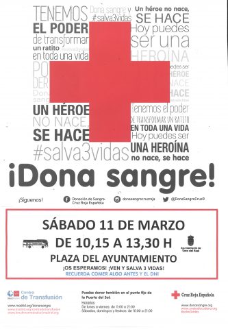 El sábado 11 de marzo desde las 10:15 de la mañana hasta las 13:30 horas, estará en la Plaza de la Villa el autobús de Cruz Roja para que los vecinos que lo deseen se acerquen a donar sangre.