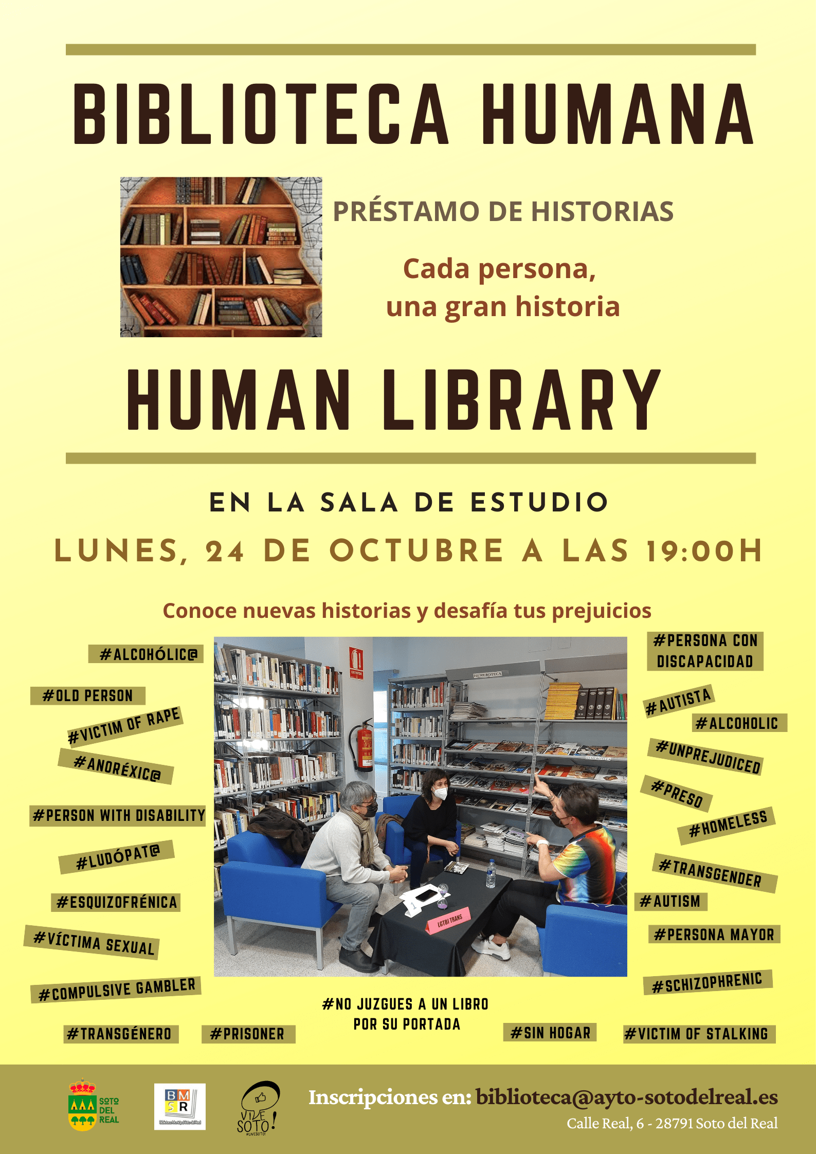 Cambiamos textos por personas que cuentan sus vivencias y experiencias de forma totalmente desinteresada. Es un concepto de biblioteca como tejido social que pretende combatir prejuicios. En lugar de prestar un libro se presta una charla con una persona con algún tipo de estigma social.