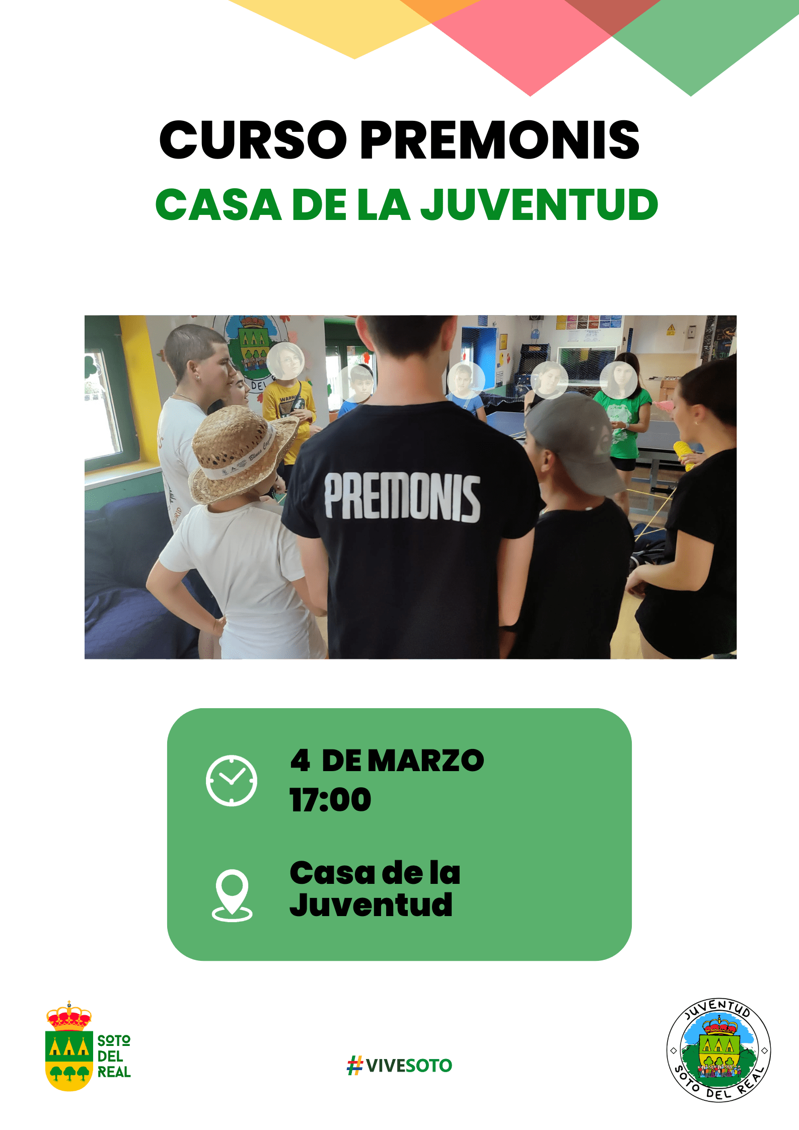 Se trata de una formación específica para jóvenes que tengan interés en el mundo del ocio y el tiempo libre, pero aún no tienen la edad exigida para el mundo de la animación y una breve toma de contacto con la relación laboral de este campo. El curso consta de: 24 horas teórico prácticas que repartiremos a lo largo del mes de marzo y abril los miercoles en sesiones de 4 h.Una salida con pernocta al Refugio La Rodela. Prácticas laborales – 25h. Las prácticas se desarrollarán en los Campamentos Urbanos de Miraflores de la Sierra o Soto del Real o en actividades relacionadas con el ocio y el tiempo libre que se organicen desde la Concejalía de Juventud del Ayuntamiento de Miraflores de la Sierra/Soto del Real. Todos los alumnos tendrán un monitor titulado de referencia durante las prácticas, que tutorizará y guiará las mismas para un aprendizaje positivo. El periodo a realizar se acordará entre los participantes y la Concejalía, y se podrán realizar a partir de la salida. La formación está subvencionada por la Escuela de Animación de la Comunidad de Madrid, dentro de la Consejería de Familia, Juventud y Asuntos Sociales.