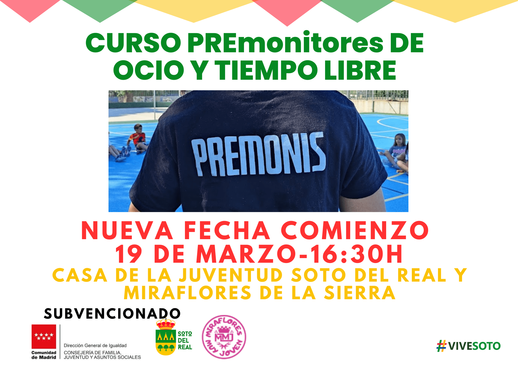 - Prácticas laborales – 25h. Las prácticas se desarrollarán en los Campamentos Urbanos de Miraflores de la Sierra o Soto del Real o en actividades relacionadas con el ocio y el tiempo libre que se organicen desde la Concejalía de Juventud del Ayuntamiento de Miraflores de la Sierra/Soto del Real. Todos los alumnos tendrán un monitor titulado de referencia durante las prácticas, que tutorizará y guiará las mismas para un aprendizaje positivo. El periodo a realizar se acordará entre los participantes y la Concejalía, y se podrán realizar a partir de la salida.La formación está subvencionada por la Escuela de Animación de la Comunidad de Madrid, dentro de la Consejería de Familia, Juventud y Asuntos Sociales.
