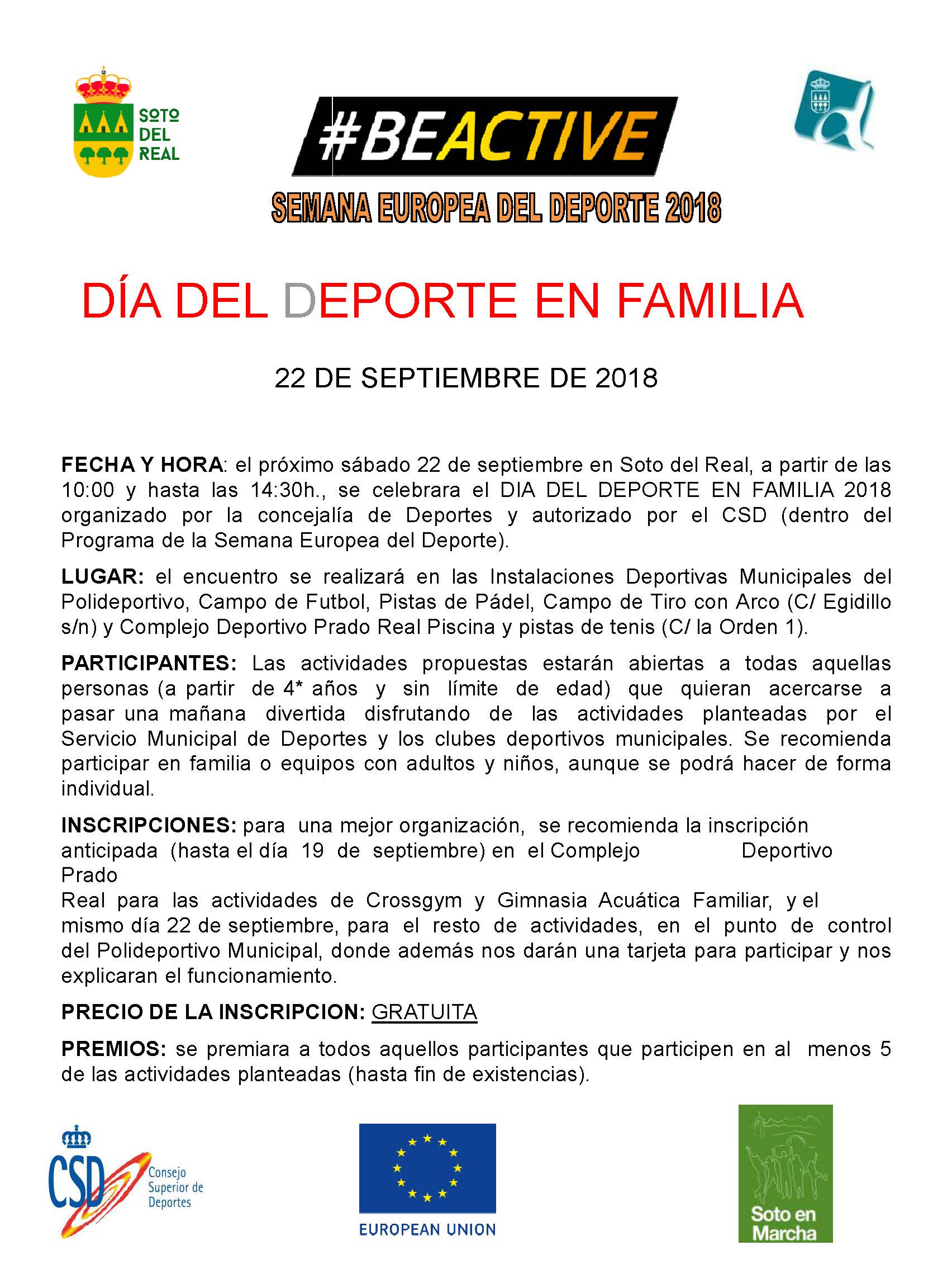 FECHA Y HORA: el próximo sábado 22 de septiembre en Soto del Real, a partir de las 10:00 y hasta las 14:30h., se celebrará el DÍA DEL DEPORTE EN FAMILIA 2018