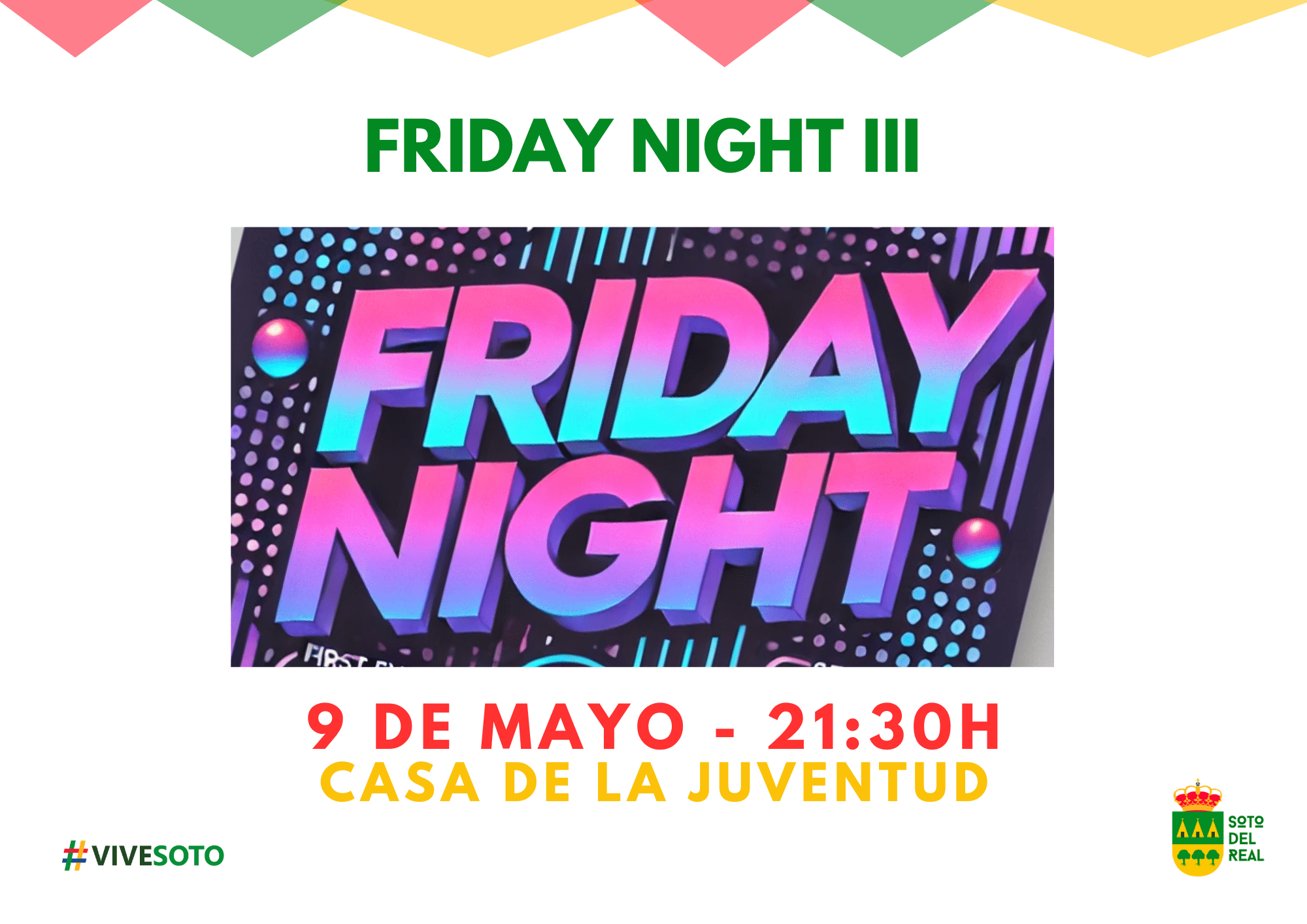 💡 FRIDAY NIGHT es un ciclo de 4 eventos nocturnos saludables que nace de la propuesta de un grupo de jóvenes de Soto del Real, que han trabajado mano a mano con la Concejalía de Juventud para hacerlo realidad. 🙌 Tú también podrás participar y ayudarnos a diseñar las siguientes actividades.