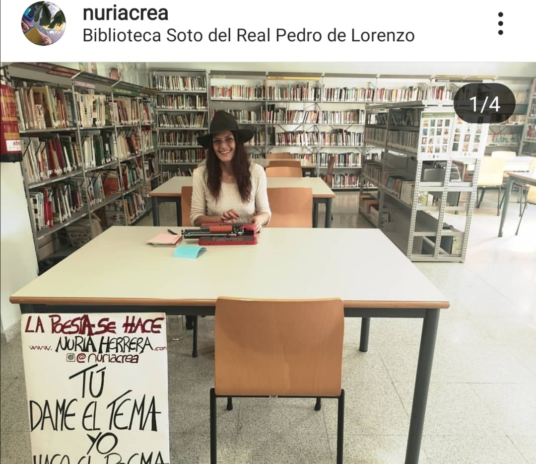 “La poesía se hace: Tú dame el tema yo hago el poema”, a cargo de Nuria Herrera. Una experiencia poética en la que tú también participas y en la que te llevas a casa un poema personalizado sobre el tema que quieras escrito a máquina por la poeta Nuria Herrera.