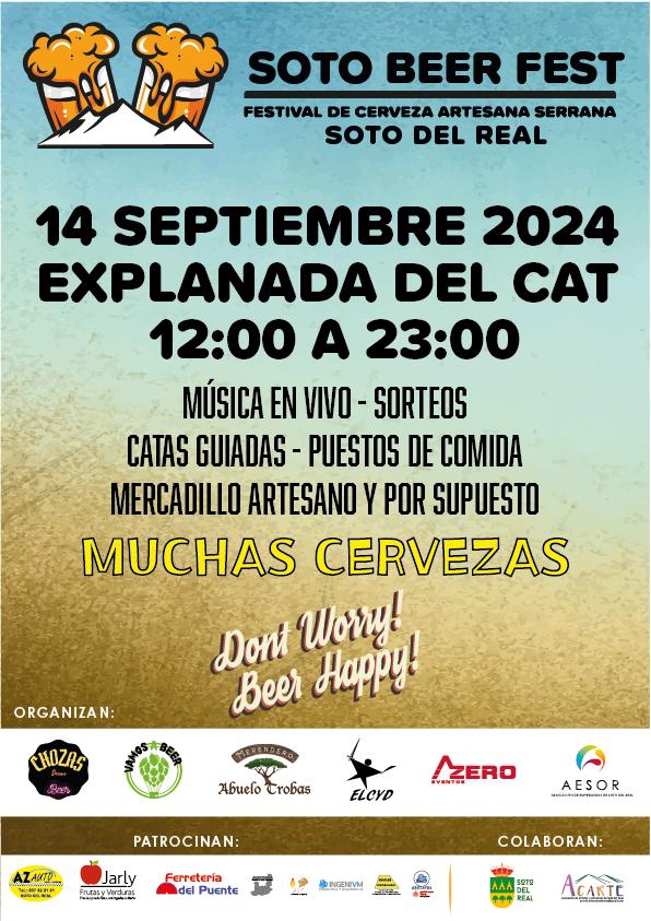 El Festival de la Cerveza Artesana Serrana de Soto del Real, donde podremos degustar cervezas artesanas de 7 cerveceras de la Sierra y habrá puestos de comida. Se instalará también un mercadillo artesano de ACARTE y podremos disfrutar de distintos eventos como cata guiada de cervezas, sorteos y música en vivo a cargo de 2 grupos musicales de la zona y un DJ local.