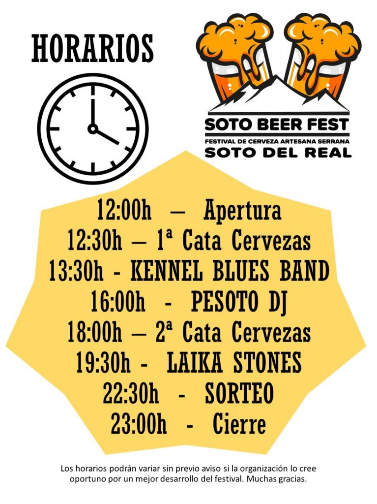El Festival de la Cerveza Artesana Serrana de Soto del Real, donde podremos degustar cervezas artesanas de 7 cerveceras de la Sierra y habrá puestos de comida. Se instalará también un mercadillo artesano de ACARTE y podremos disfrutar de distintos eventos como cata guiada de cervezas, sorteos y música en vivo a cargo de 2 grupos musicales de la zona y un DJ local.