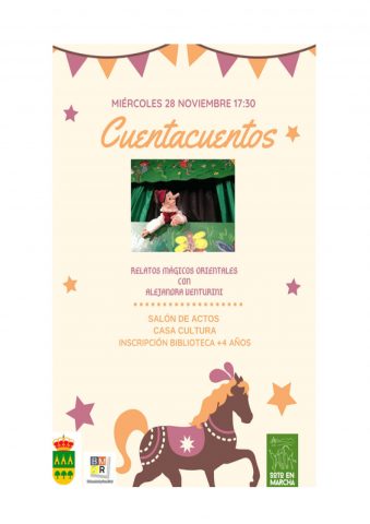 Por Alejandra Venturini 28 de noviembre, de 17:30 a 18:30 h. Salón de actos de la Casa de la Cultura Destinado a público infantil a partir de 3 años. Es necesaria inscripción previa a través del e-mail biblioteca@ayto-sotodelreal.es o en el número de teléfono 91 848 01 14 GRATUITO