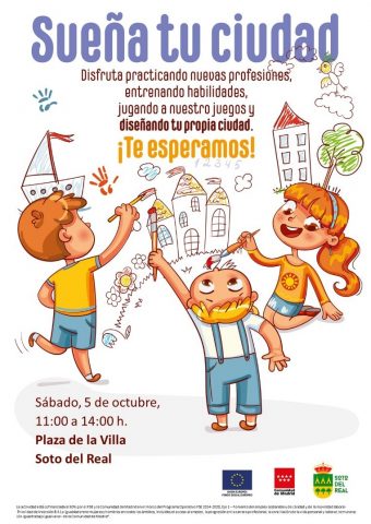 SUEÑA TU CIUDAD: TALLERES EN FAMILIA Sábado 5 de octubre De 11:00 a 14:00 h Plaza de la Villa Gyncana Simulación de una pequeña ciudad igualitaria realizando actividades educativas en los distintos “espacios de la ciudad”. A partir de 4 años. INSCRIPCIONES: Casa de la Cultura. ACTIVIDAD GRATUITA