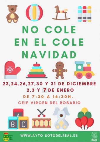 NO COLE EN EL COLE 23, 24, 26, 27, 30 y 31 de diciembre 2, 3 y 7 de enero 9:00 a 16:30 CP Virgen del Rosario Casa de la Cultura de 9:00 a 14:00 y de 16:00 a 20:00 o por correo electrónico en: centrocultural@ayto-sotodelreal.es Precio: desde 8,00 € el día + 6,00 € […]