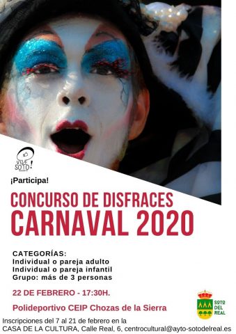 SÁBADO 22 Carnaval 2020 – Pasacalles con batucada y Concurso de disfraces 17:00h Pasacalles con batucada desde la Plaza de la Villa hasta el CEIP Chozas de la Sierra 17:30 h Concurso de disfraces en el Pabellón polideportivo CEIP Chozas de la Sierra. INSCRIPCIONES: Inscripción previa en Casa de la Cultura, del día 7 al 21 […]