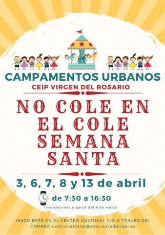 CAMPAMENTO URBANO NO COLE EN EL COLE: SEMANA SANTA 3, 6, 7, 8, Y 13 DE ABRIL.(DE 9:00 A 16:30 CON POSIBILIDAD DE AMPLIACIÓN A LAS 7:30) COLEGIO PÚBLICO VIRGEN DEL ROSARIO Niños desde Primero de Infantil hasta Sexto de Primaria INSCRIPCIONES: aquí y en la Casa de la Cultura: de 9:00 a 14:00 y […]