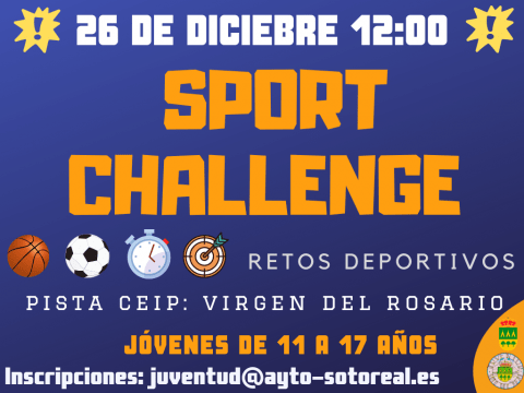 El próximo 26 de diciembre tienes una cita con #Juventud #SotodelReal ¡No te pierdas el evento SPORT CHALLENGE! Una actividad gratuita para jóvenes de 11 a 17 años en la pista del CEIP Virgen del Rosario donde el #deporte y la diversión están asegurados. Para participar sólo tienes que inscribirte y estar dispuesto a disfrutar de una jornada […]