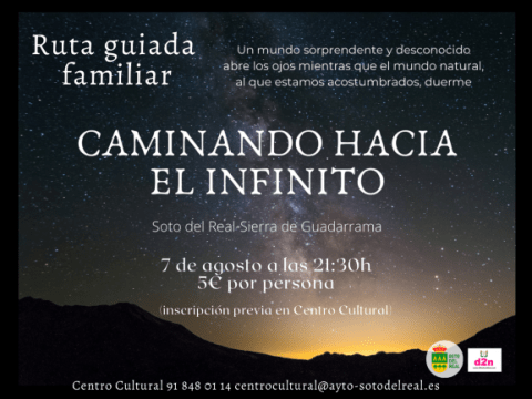 Ruta guiada familiar nocturna, y observación de estrellas aprovechando la luna nueva. LUGAR: por determinar. PÚBLICO: Familiar – a partir de 6 años. PRECIO: 5€ por persona. INSCRIPCIONES: Casa de la Cultura de Soto del Real; Tel. 918480114; centrocultural@ayto-sotodelreal.es