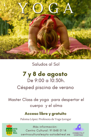 Saludos al Sol en el Municipio de Soto del Real Especial Master Class de Yoga, despierta cuerpo y alma a través del yoga. CLUB CONECTA-T a TI 7 y 8 de agosto en la pradera de la Piscina Municipal de Verano De 9:00 a 10:30 h. Traer esterilla de yoga