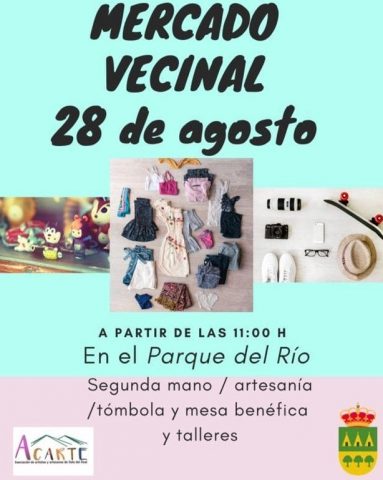 MERCADO VECINAL con productos de segunda mano, artesanía, tómbola, mesa benéfica y talleres. 28 DE AGOSTO en el Parque del Río ORGANIZADO POR ACARTE