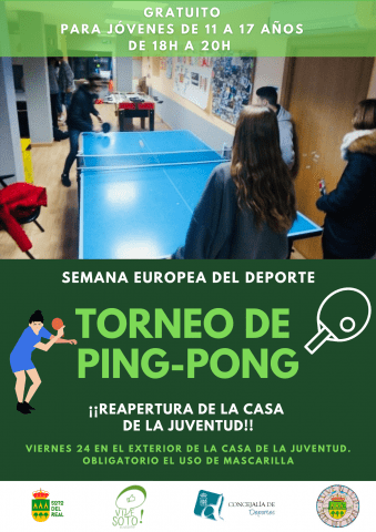 EVENTO: TORNEO DE PING PONG EN LA CASA DE LA JUVENTUD DÍA: Viernes-24 LUGAR: Jardines de la Casa de la Juventud. HORARIO: 18:00 h – 20:00 h. EDADES: Jóvenes de 11 a 17 años. PRECIO: GRATUITA ORGANIZACIÓN: CONCEJALÍA DE JUVENTUD