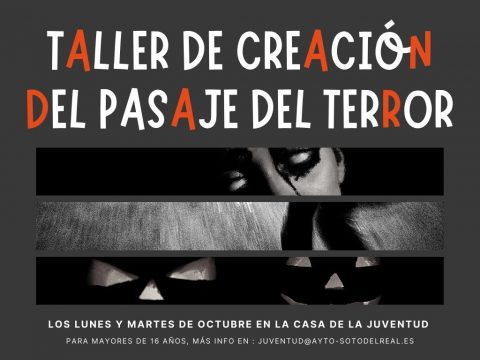 LUGAR: Casa de la Juventud; DÍAS: lunes y martes de octubre; HORA: 18:00 a 20:00 h PÚBLICO: mayores de 16 años; INSCRIPCIONES: juventud@ayto-sotodelreal.es Forma parte del pasaje de terror organizado por la Casa de la Juventud y vive la aventura desde dentro. Aporta tus ideas y ayuda a crear la noche más terrorífica del año.