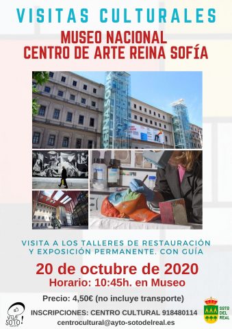 Visita a los talleres de restauración del Museo con personal del mismo y posterior visita guiada al Museo Nacional Centro de Arte Reina Sofía. LUGAR: Museo Reina Sofía; PUNTO DE ENCUENTRO: Museo Reina Sofía; HORA: 10:45 H; PRECIO: 4,5€; INSCRIPCIONES: hasta el 15 de octubre en el Centro Cultural / Tlf. 918480114 / centrocultural@ayto-sotodelreal.es