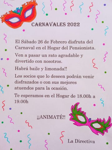 FIESTA DE DISFRACES EN EL HOGAR DEL PENSIONISTA El sábado 26 de febrero prepárate para pasarlo genial en el Hogar, un plan en el que reír y disfrutar del fin de semana con esta celebración. Habrá baile y limonada para los asistentes a la fiesta, ¡todo listo para pasarlo bien! Los socios que lo deseen […]