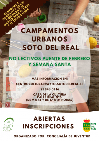 LUGAR: CEIP Virgen del Rosario. DÍAS: 8, 11, 12, 13 y 18 de abril. PÚBLICO: escolar de infantil y primaria. INSCRIPCIONES: Las inscripciones se pueden descargar aquí deben realizarse en el Centro Cultural o mediante el correo electrónico centrocultural@ayto-sotodelreal.es , pudiendo seleccionarse días sueltos o todos los días. Todas las actividades estarán adaptadas a la normativa COVID -19, puedes consultarlo aquí y cumplimenta […]