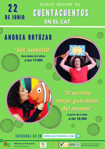 CUENTACUENTOS SESIÓN DOBLE: SOL SOLECITO Y EL SECRETO MEJOR GUARDADO DEL MUNDO. LUGAR: C.A.T. HORA SOL SOLECITO: 17:00 h; PÚBLICO: de 0 a 3 años; HORA EL SECRETO MEJOR GUARDADO DEL MUNDO: 18:30 h; PÚBLICO: a partir de 4 años; ENTRADAS: 3€ en mutickeros.com