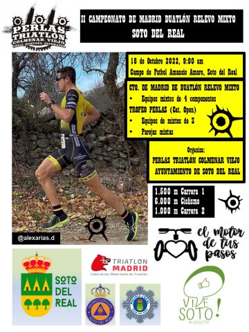 II CAMPEONATO DE DUATLÓN RELEVO MIXTO SOTO DEL REAL. El próximo 16 de octubre Soto acoge la II edición del campeonato de Madrid de duatlón supersprint de relevos mixtos de 4 componentes en que vendrán l@s mejores duatletas de Madrid. En esta prueba pueden participar deportistas desde los 14 años al ser distancias cortas. ¡Descuento […]