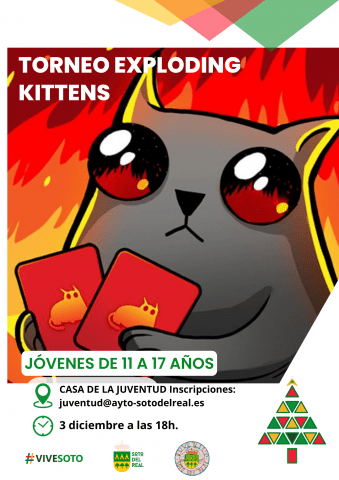 LUGAR: Casa de la Juventud; DÍA: 3 de diciembre. HORA: 18:00 h; INSCRIPCIONES: A través de juventud@ayto-sotodelreal.es y entre la hora de apertura de la Casa de la Juventud y el inicio de la actividad. PRECIO: gratuito. Juego rápido de cartas de 5 en 5 donde sobreviven los últimos en “Explotar”. Aquellos que no lo […]