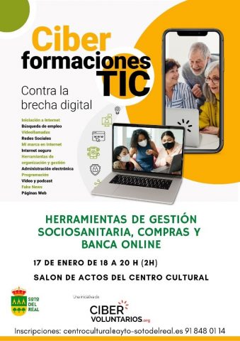 LUGAR: Biblioteca municipal ; DÍAS: 17, 24 y 31 de enero; HORA: 17:00 a 19:00 h; Taller de consulta y asesoramiento tecnológico para personas mayores. Impartido por jóvenes voluntarios. Consulta de dudas de WhatsApp, correo electrónico, internet, compras online, redes sociales...