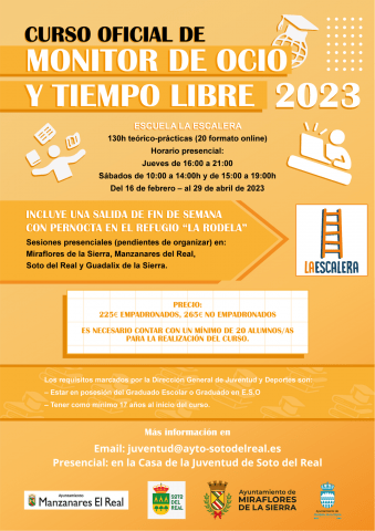 LUGAR: Casa de la Juventud; DÍA: 16 febrero al 15 de abril (jueves y sábados); HORA: Jueves 16:00 a 21:00 h y sábados de 10:00 a 14:00 h y 15:00 a 19:00 h INSCRIPCIONES: juventud@ayto-sotodelreal.es EDADES: a partir de 17 años. Curso de MTL impartido por la Escuela la escalera. Curso organizado por ayuntamientos de […]