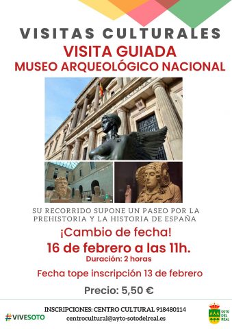 LUGAR: Madrid; HORA: 11:00 h; INSCRIPCIONES: hasta el 13 de febrero en el Centro cultural o el mail centrocultural@ayto-sotodelreal.es PRECIO: 5,50€ Ubicado en la Calle Serrano, es el principal museo español dedicado a la arqueología. Su colección se basa en piezas procedentes de diversos yacimientos y enclaves de toda la geografía de España, desde la […]