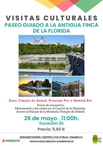 DÍA: 26 de mayo; HORA: 11:00 h; LUGAR DE ENCUENTRO: acceso Templo Debod en el monumento a los caídos en el cuartel de la Montaña; PÚBLICO: adultos; INSCRIPCIÓN: 5,50€ en el Centro Cultural (30 plazas) .
