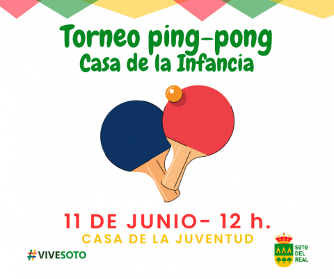 DÍA: 11 de junio; HORA: 11:00 h; LUGAR: Casa de la Infancia; PÚBLICO: Niños y niñas de 4º a 6º de primaria. Nacidos 2011 a 2013; INSCRIPCIONES: No hace falta inscripción. Acudir 5’ antes del inicio del evento. Torneo de Ping Pong para niños y niñas de 4º a 6º de primaria