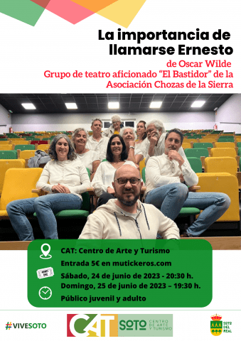 DÍA: 24 de junio; HORA: 20:30 h; LUGAR: C.A.T; PÚBLICO: público juvenil y adulto; ENTRADA: 5€ EN MUTICKEROS.COM; Grupo de teatro aficionado “El Bastidor” de la Asociación Chozas de la Sierra, representa esta divertida obra de Oscar Wilde. Dirección: José Bernardo Luna Adaptación: Ana Aranda