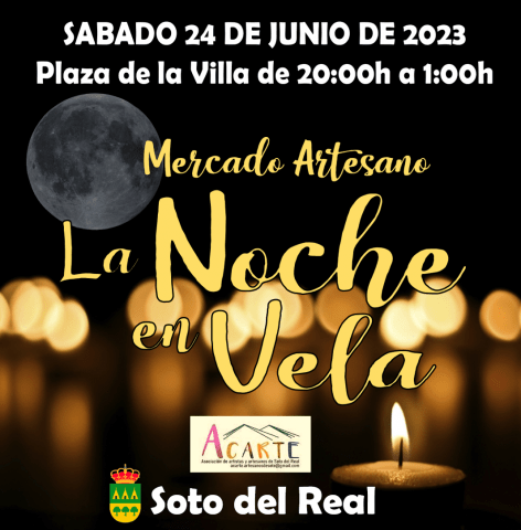 DÍA: 24 junio; HORA: a partir de las 20:00 h; LUGAR: Plaza de la Villa; Un año más ACARTE organiza el festival la tradicional Noche en Vela. Las artesanas de la asociación pondrán a la venta sus creaciones en un ambiente acogedor a la luz de las velas y amenizado por un concierto.