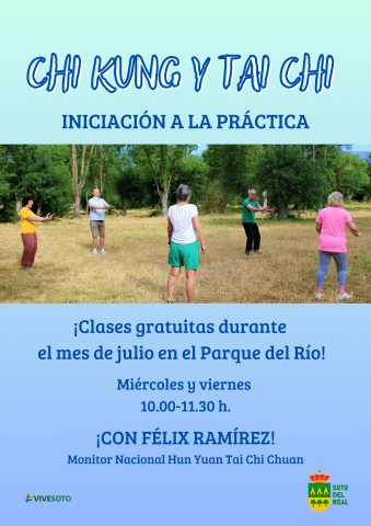 Sesiones de chi kung y Tai chi al aire libre , en el Parque del Rio, donde podrán participar cualquier persona dispuesta a disfrutar de una actividad tranquila. INSCRIPCIONES: gratuitas hasta completar aforo. LUGAR: Parque del Río; DÍAS: miércoles y viernes de julio; HORA: 10:00 a 11:30 h.