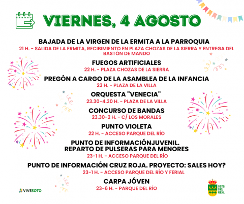 Bajada de la Virgen del Rosario desde la Ermita hasta la Parroquia 21:00 h. Salida desde la Ermita, recibimiento en la Plaza de Chozas de la Sierra y entrega del bastón de mando. Fuegos Artificiales 22:00 h. Plaza Chozas de la Sierra Pregón de Fiestas 23:00 h. Plaza de la Villa Orquesta […]