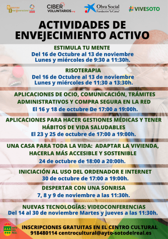 DÍA: 16 de octubre a 13 de noviembre (LUNES Y MIÉRCOLES) / 16, 18, 23, 25 /30 de octubre y 6, 8 y 13 de noviembre ; HORA: de 9:30 a 11:30 h; LUGAR: Centro Cultural; INSCRIPCIONES: previa hasta 6 de octubre – Centro Cultural; Talleres de promoción del envejecimiento saludable de la Asociación Solidaridad […]