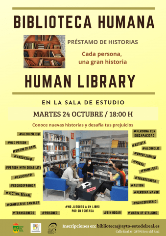 DÍA: 24 de octubre; HORA: 18:00 a 20:00 h; LUGAR: Biblioteca; INSCRIPCIONES: gratuitas en la biblioteca; Esta iniciativa pretende conectar a personas de diferentes culturas, razas y opiniones para que cuenten su historia. Se cambian los textos por personas que cuentan sus vivencias y experiencias de forma totalmente desinteresada. Es un concepto de biblioteca como […]