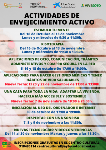 DÍA: 14, 16, 21, 23, 28 y 30 de noviembre; HORA: 11:30 h; LUGAR: Centro Cultural; INSCRIPCIONES: previa hasta 6 de noviembre– Centro Cultural; Dirigido a aquellas personas mayores que quieran conocer las herramientas que se han hecho más populares durante el confinamiento para realizar encuentros virtuales con las personas que queremos y que por […]