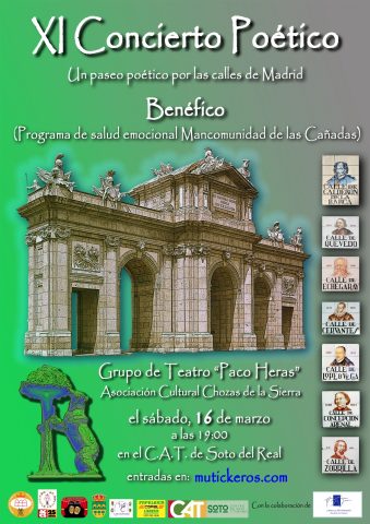 DÍA: 16 de marzo; LUGAR: C.A.T.; HORA: 19.00 h: ENTRADAS: 5€ en mutickeros.com Recital poético del grupo de teatro Paco Heras. Asociación Cultural Chozas de la Sierra. La Asociación lleva produciendo y representando Conciertos Poéticos desde el año 2009, este es el número XI. Este espectáculo será a beneficio del programa juvenil de salud emocional de […]