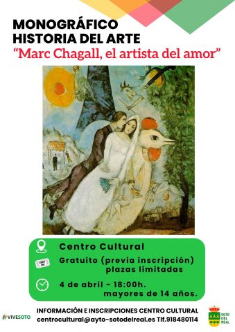 MONOGRÁFICO HISTORIA DEL ARTE. "Marc Chagall, el artista del amor" “ En nuestra vida hay un solo color, como en la paleta de un artista, que ofrece el significado de la vida y el arte. Es el color del amor” M. Chagall. DÍA: 4 de abril; HORA: 18:00 h; LUGAR: Centro Cultural; PRECIO: […]