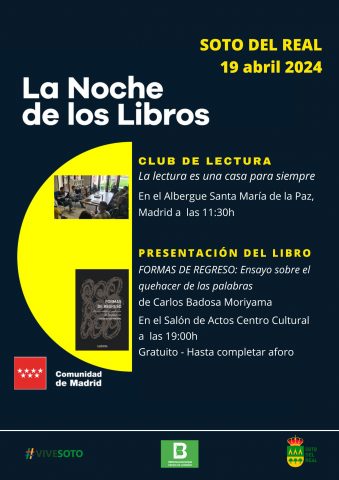 DÍA: 19 abril; HORA: 19:00 h; LUGAR: Centro cultural. ENTRADA: libre hasta completar aforo; La Noche de los Libros: Presentación del libro: Formas de regreso: ensayo sobre el quehacer de las palabras, de Carlos Badosa Moriyama.