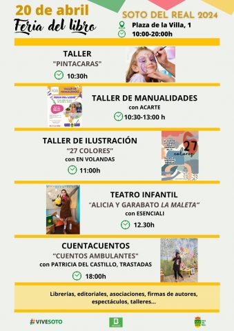 DÍA: 20 abril; HORA: 10:00 a 20:00 h; LUGAR: Plaza de la Villa. ENTRADA: libre hasta completar aforo; Feria del libro con carpas para librerías, editoriales y asociaciones. Se programarán múltiples actividades: talleres literarios, firma de autores, espectáculos de narración oral… EVENTOS: 10:00-11:00 h. y 17:00-18:00 h. Taller Pintacaras 10:30-13:00 h Taller de manualidades con […]