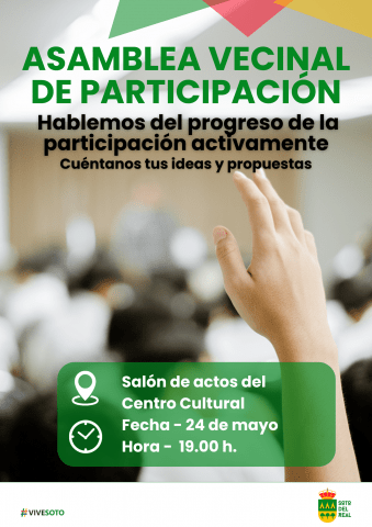 DÍA: 24 de mayo; HORA: 19.00 h. LUGAR: Salón de actos Centro Cultural Hablaremos sobre el progreso de la participación activamente y podrás contarnos tus ideas y propuestas.