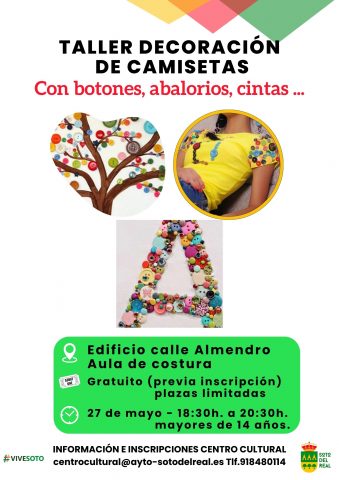 “Trae tu camiseta, prepara un diseño y decórala con botones, abalorios, cintas....” DÍA: 27 de mayo; HORA: de 18:30 a 20:30 h; LUGAR: Aula Costura Edificio Almendro; PRECIO: Gratuito; INSCRIPCIONES: Centro Cultural. Mayores de 14 años.