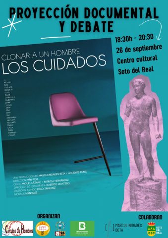 PROYECCIÓN DOCUMENTAL Y DEBATE: "CLONAR A UN HOMBRE: LOS CUIDADOS". Fecha: 26 de septiembre Hora: 18.30-20.30 h. Lugar: Centro Cultural. Documental que aspira a alimentar la conversación sobre las masculinidades, para aumentar la corresponsabilidad de los hombres en los cuidados. Entrevistas y testimonios de varones, diversos en edades, contextos y experiencias.