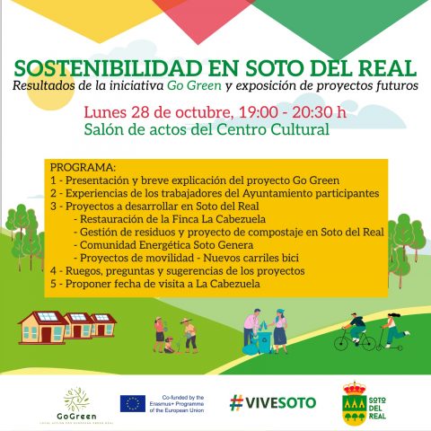 Día: 28 octubre; Hora: 19.00 h. Lugar: Salón de actos Centro Cultural El próximo lunes 28 de octubre, a partir de las 19.00 h. en el Centro Cultural, se va a realizar una conferencia sobre sostenibilidad en nuestro municipio, en la que se expondrán los resultados de la iniciativa Go Green y las buenas prácticas aprendidas de otros […]