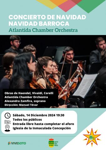 TIPO DE ACTIVIDAD: CONCIERTO DE NAVIDAD: NAVIDAD BARROCA - ATLANTIDA CHAMBER ORCHESTRA DÍA: Sábado 14 de Diciembre; HORA: 19:30 h; LUGAR: Iglesia Parroquial; ENTRADAS: entrada libre hasta completar aforo. NAVIDAD BARROCA: Obras de Haendel, Vivaldi, Corelli. Atlantida Chamber Orchestra Alexandra Zamfira, soprano Dirección: Manuel Tévar