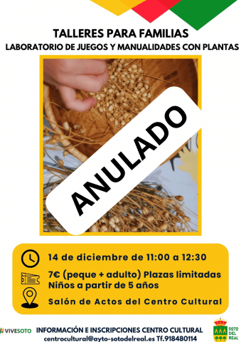 DÍA: 14 de diciembre; HORA: 11:00 a 12:30 h; LUGAR: Centro Cultural Pedro de Lorenzo; INSCRIPCIONES: Centro Cultural; PRECIO: 7€ la pareja (niño + adulto). Contenidos Mostrar y explicar plantas al natural. Realizar una estimulación olfativa y visual de las plantas. Mostrar diferentes plantas y frutos que se pueden utilizar para hacer tinta, instrumentos y […]